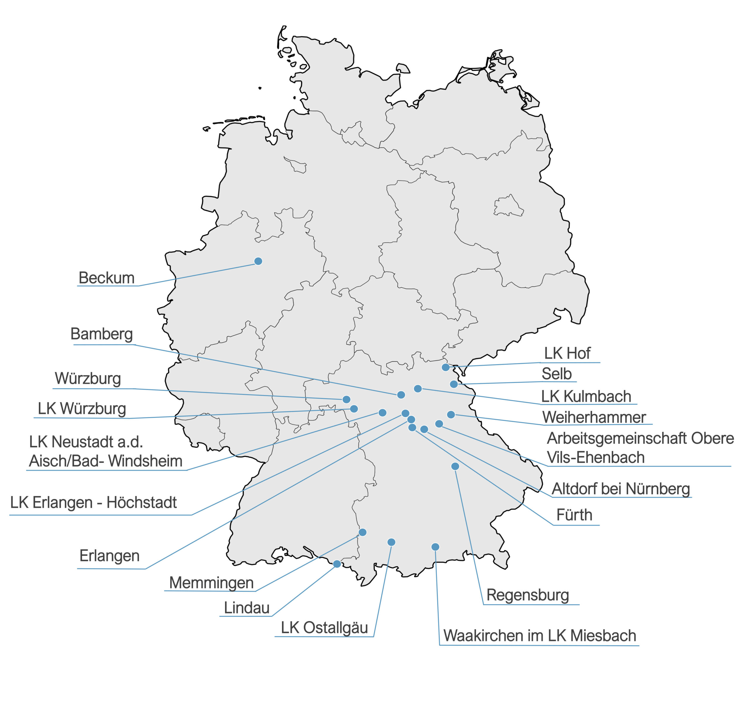 Altdorf b. Nürnberg Arbeitsgemeinschaft Obere Vils-Ehenbach (AOVE) Bamberg Beckum Erlangen Fürth Landkreis Hof Landkreis Kulmbach Lindau Memmingen Landkreis Ostallgäu Regensburg Selb Waakirchen Weiherhammer Würzburg Landkreis Würzburg